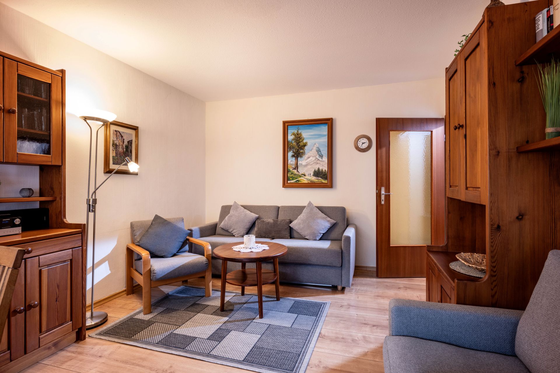 Gemütlich eingerichtete Ferienwohnung im Erdgeschoss mit separater Küche, Bad mit Badewanne, Schlafzimmer mit einem Doppelbett, einem hellen Wohnraum mit gemütlicher Essecke.