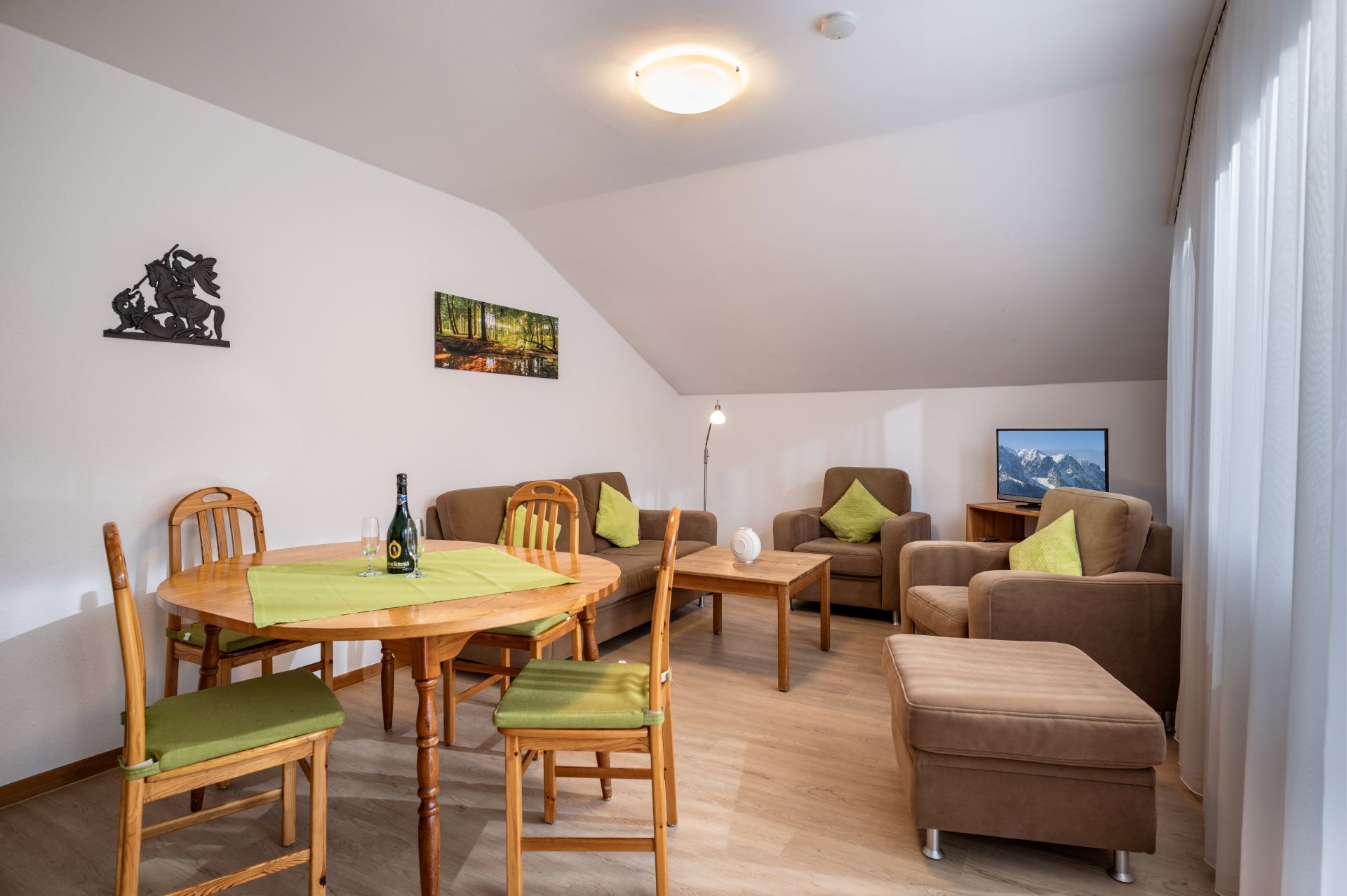 Freundlich eingerichtete Ferienwohnung im Obergeschoss mit separater Küche, Bad mit Badewanne, Schlafzimmer mit einem Doppelbett und Kinderzimmer mit 2 Betten. Der helle Wohnraum verfügt über eine gemütliche Essecke und Couch. Platz genug für 2 oder mehr Erwachsene oder einer kleinen Familie. Der Balkon lädt nach einem ereignisreichen Tag zum Sitzen im Freien ein. Die Küche ist mit einem Kühlschrank, Mikrowelle und einem 4-Plattenherd, sowie Kaffeemaschine, Toaster, Wasserkocher und Küchenutensilien ausgestattet. Die Wohnung liegt in einer familienfreundlichen Anlage mit Spielplatz, Ruheinseln im Garten und Hallenbad in ruhiger Lage am Tor zu den Alpen. Ohne das Haus verlassen zu müssen, haben Sie im Untergeschoss direkten Zugang zu Spielzimmer, Sauna, Fitnessraum und Schwimmbad.