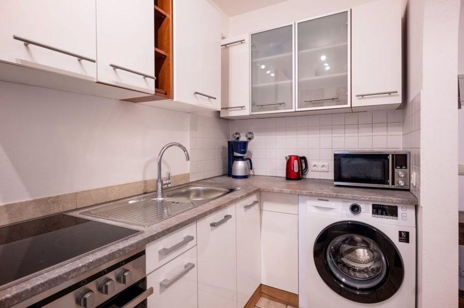 Küche: Essbereich, Esstisch, 4-Platten Herd, Backofen, Hochstuhl, Kaffeemaschine, Küchenzeile, Kühlschrank, Mikrowelle,Gefrierschrank mit 3 Schubläden, Toaster, Wasserkocher, Weingläser, Waschmaschine