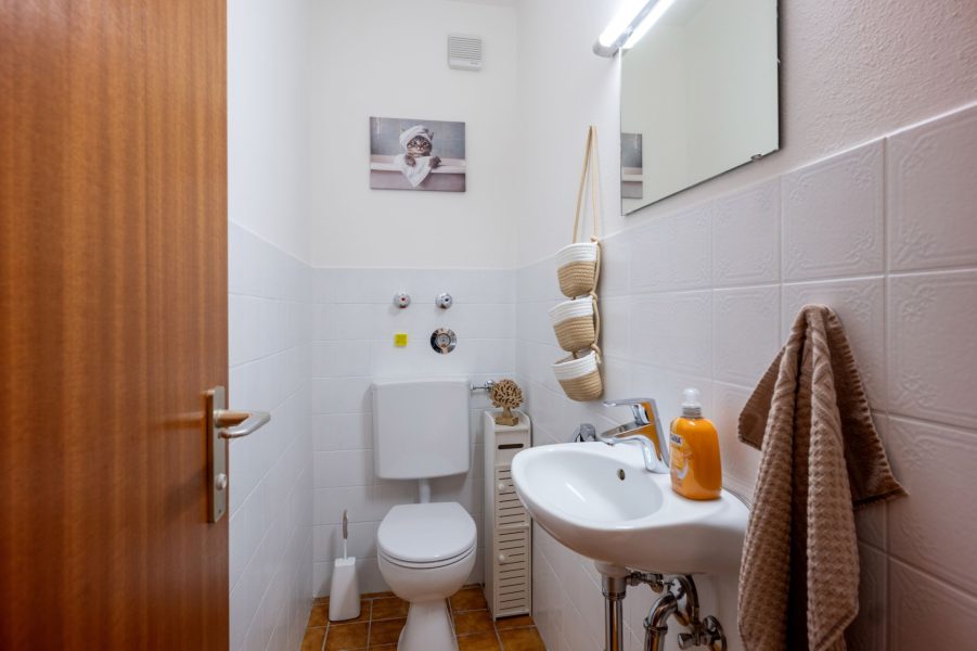 Badezimmer: Dusche, Haartrockner, Toilettenpapier, WC